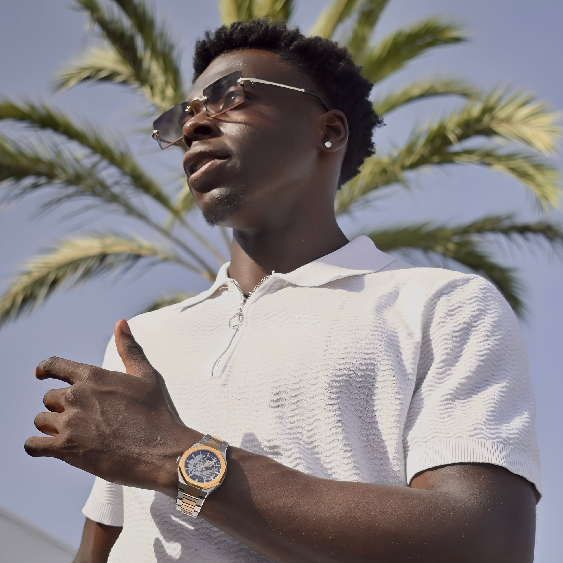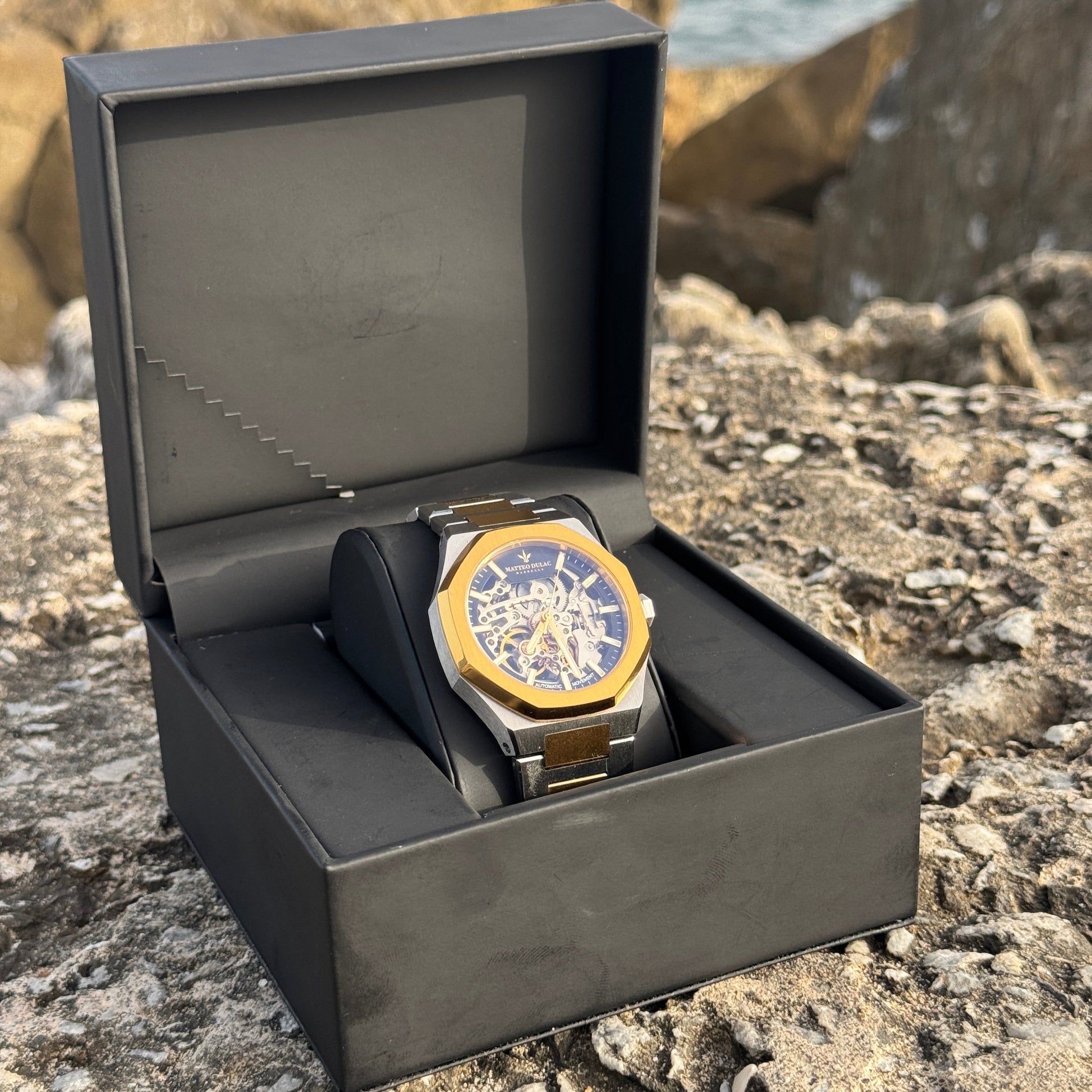 The MD02 Two-Tone. 40 mm of 316L steel merging gold and silver in perfect balance. Automatic skeleton dial, applied indices, movement exposed.